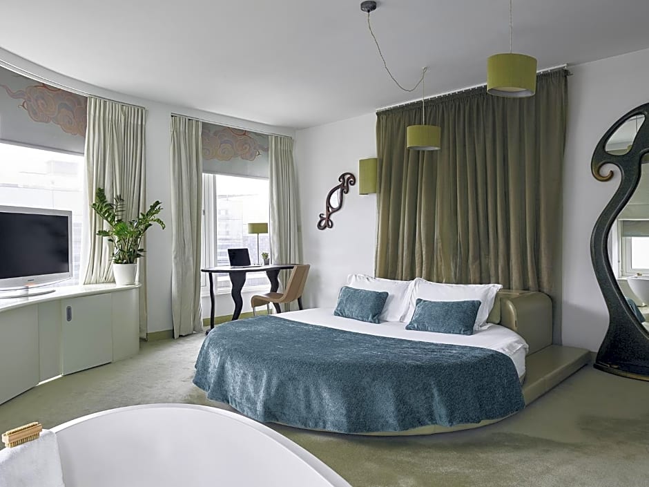 With its king size circular bed, this designer bedroom has a flat-screen TV, free WiFi, a mini-bar and air conditioning.
